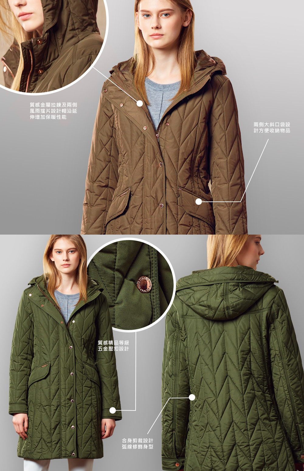 4.長版女大衣以幾何圖紋設計呈現視覺修身效果,帽簷可延伸,可依氣候適時調整