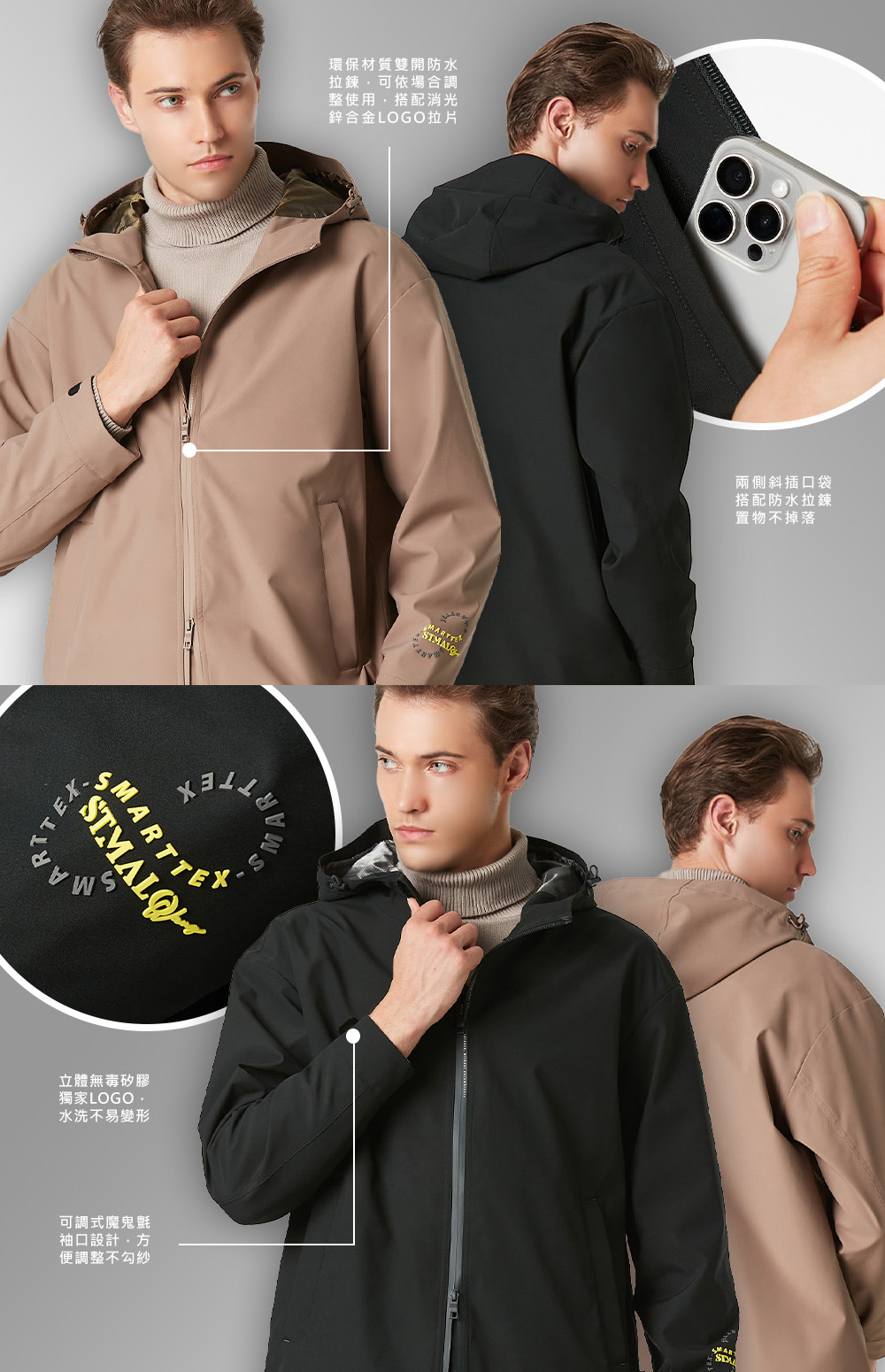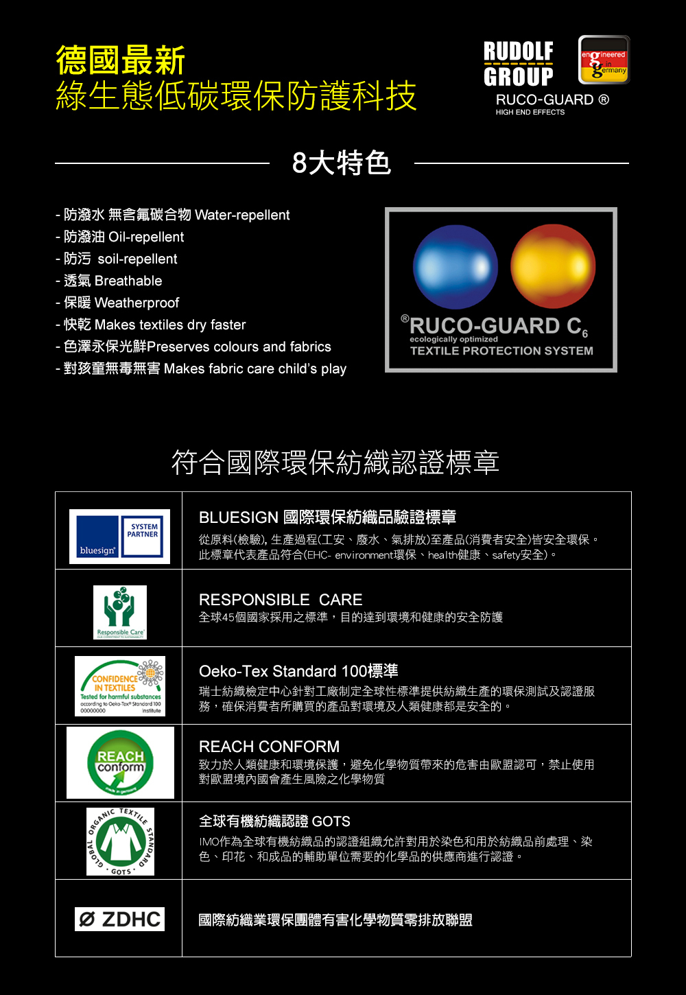 ▪表布採用interlock雙面微彈針織布料,以3層防水技術貼合,挺度同精品風衣外套;結合德國Ruco-guard科技,防水防油防髒汙
