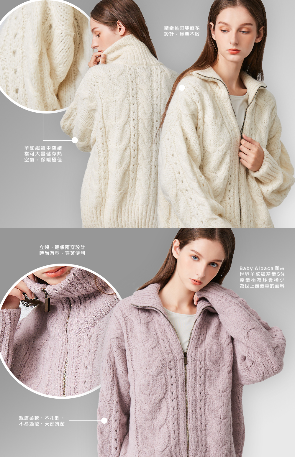 ▪百萬精品機台訂製經典鑽形扭結紋結構,搭配法式高領設計修飾肩頸線條,毛衣與外套雙穿版型,演繹慵懶與高雅並存的女性魅力。