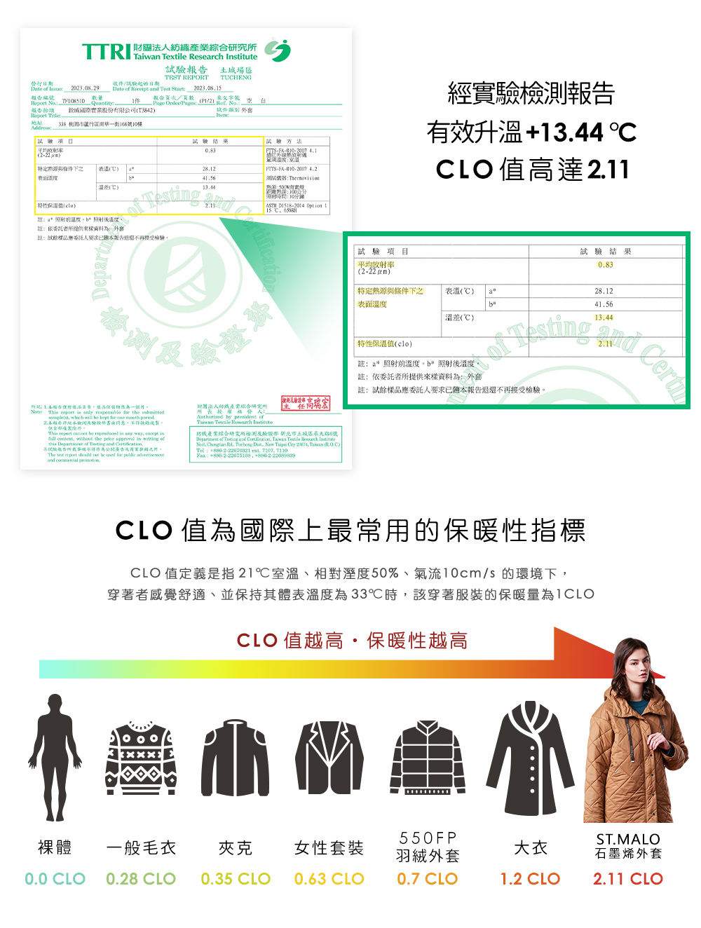 ▪黑金超導熱科技-石墨烯GRAPHENE,強效蓄熱促進循環,CLO值2.11相當於3件羽絨外套,實驗證實有效升溫高達13.44度
