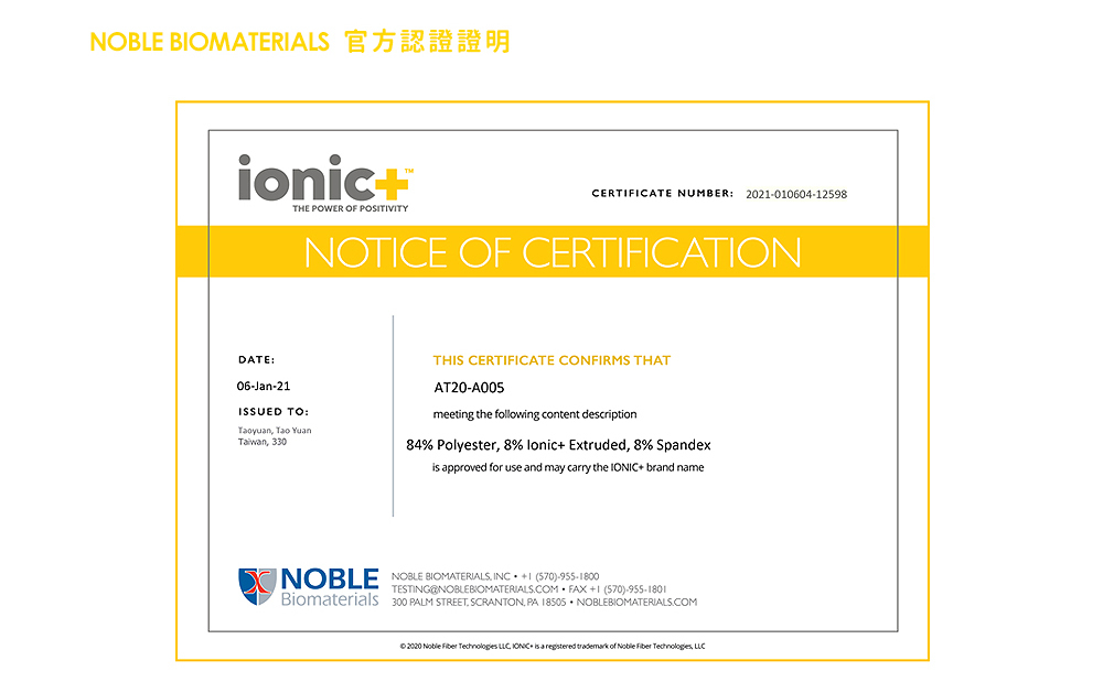 ▪️ 美國 NOBLE官方授權: IONIC+銀纖維繡花認證標